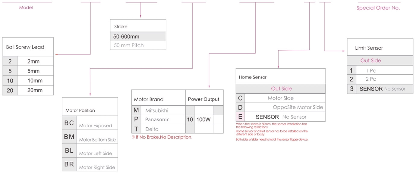 | Utiliser là | Mode de conduite | Spécifications du modèle | Puissance du moteur (W) | Largeur (mm) | Répétabilité (mm) | Spécifications de la vis à billes | Charge utile maximale (kg) | vitesse maximale (mm/s) *1 | ||