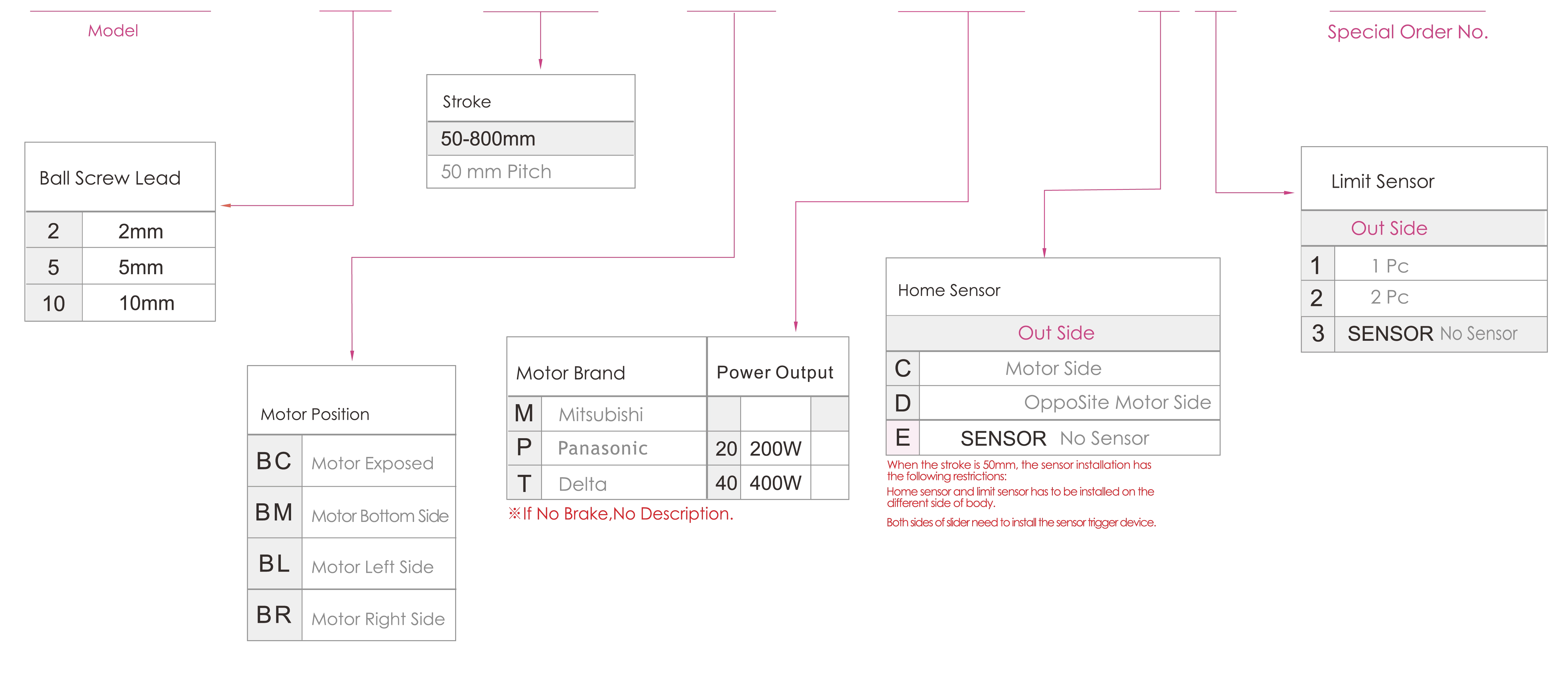 | Utiliser là | Mode de conduite | Spécifications du modèle | Puissance du moteur (W) | Largeur (mm) | Répétabilité (mm) | Spécifications de la vis à billes | Charge utile maximale (kg) | vitesse maximale (mm/s) *1 | ||