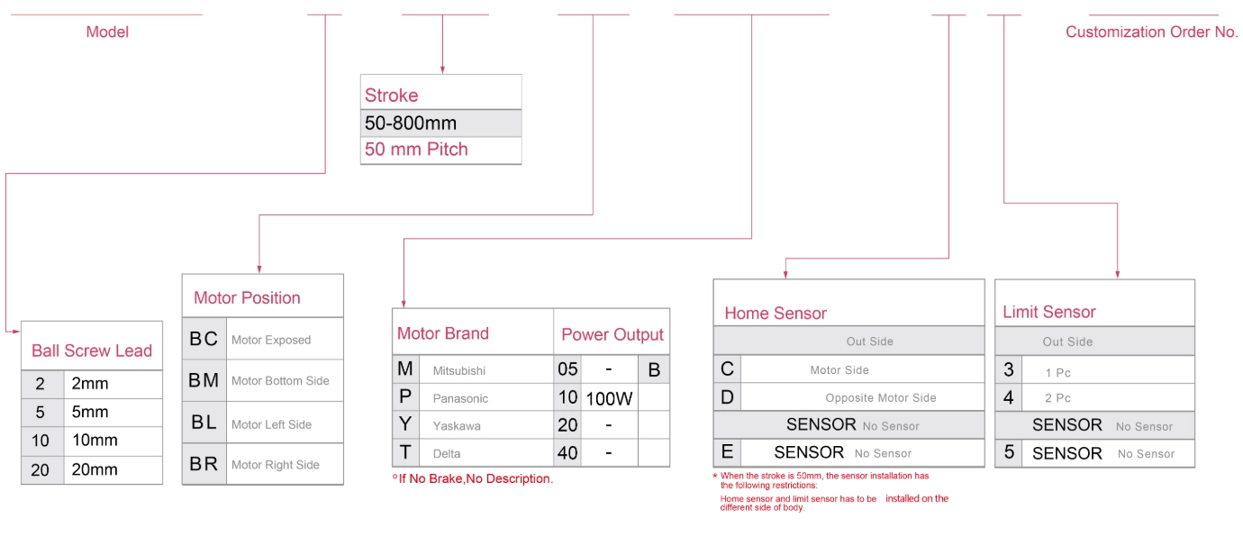 | Utiliser là | Mode de conduite | Spécifications du modèle | Puissance du moteur (w) | Largeur (mm) | Répétabilité (mm) | Spécifications de la vis à billes | Charge utile maximale (kg) | vitesse maximale (mm/s) *1 | ||