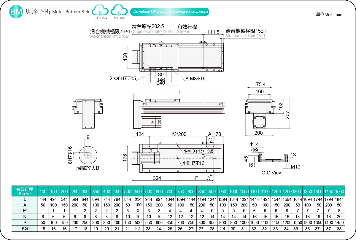 | Guide linéaire haute rigidité (mm) | Actionneur à vis à billes | |||||