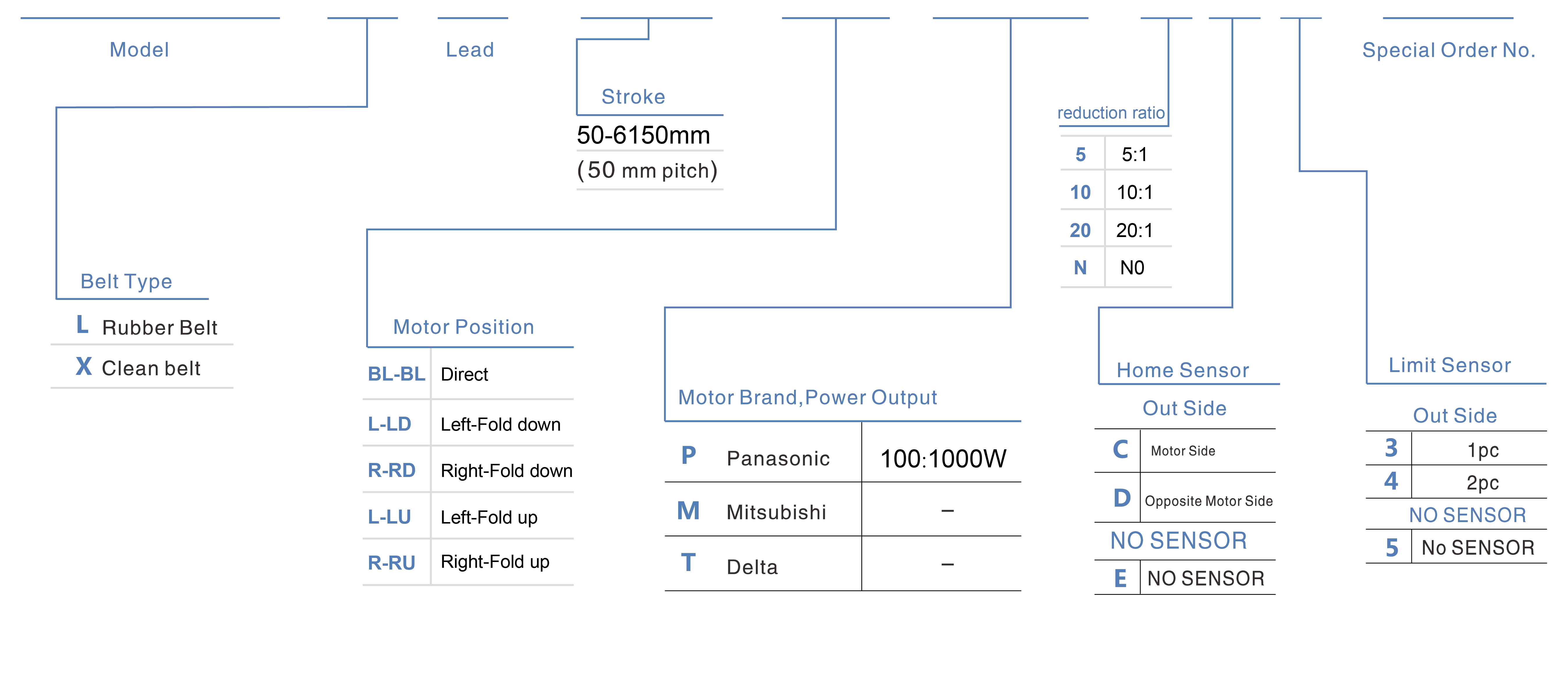 | Utiliser là | Mode de conduite | Spécifications du modèle | Mécanisme réducteur | Puissance du moteur (w) | Largeur (mm) | Répétabilité (mm) | Spécifications de la courroie | Charge utile maximale (kg) | vitesse maximale (mm/s) *1 | ||