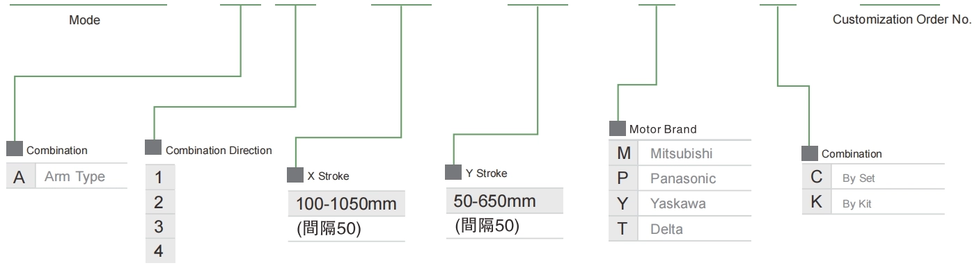 | Utiliser là | Mode de conduite | Spécification | Combinaison | Numéros d'axe | Vitesse maximale (mm/s) | Course (mm) | ||||