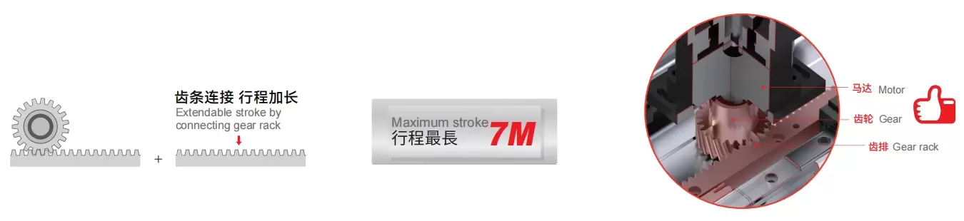 Grâce à l'utilisation d'un entraînement par engrenages, il n'y a pas d'entraînement par vis sans fin lors des longs déplacements, et le problème d'enroulement de la vis est éliminé. La structure de transmission est entraînée linéairement par la crémaillère.