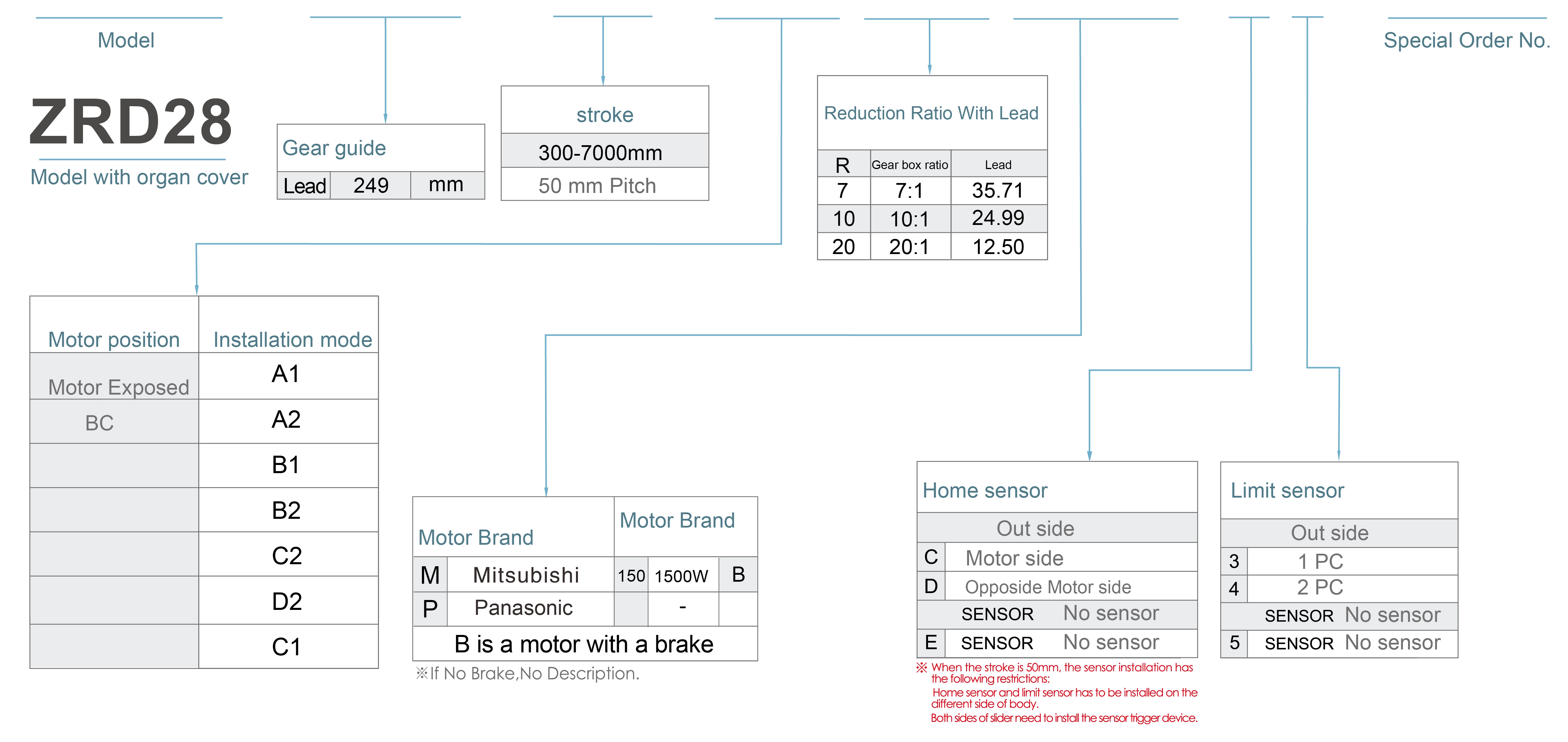 | Utiliser là | Mode de conduite | Spécifications du modèle | Puissance du moteur (W) | Largeur (mm) | Répétabilité (mm) | Le ratio des diminuateurs | Taille de l'engrenage hélicoïdal (mm) | Charge utile maximale (kg) | vitesse maximale (mm/s) *1 | |||